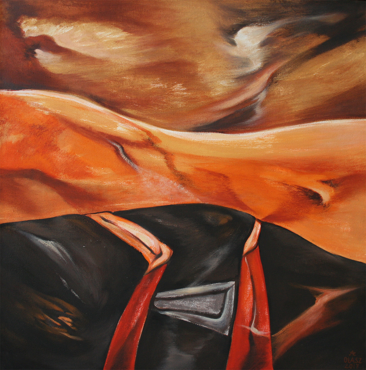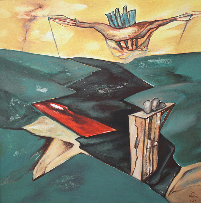 Olasz Attila kiállítása kiváló alkalom arra, hogy teszteljük magunkat. Georges Braque szerint egy kép megértéséhez nincs szükség egyébre, mint egy székre és időre. Figyelni, megfigyelni, látni és meglátni. Észrevenni Attila Az Őrző című kisplasztikájában a részletekben rejlő szimbólumokat, az Égi látogató című festményén a szakrális és a profán párbeszédét, Fölötte című képének sokrétegű transzcendenciáját, A világ tengelye mögött rejtező évezredes jelképtartalmakat. Nézni, figyelni, megfigyelni, látni és meglátni, fölfejteni, fölfedezni, kibontani, elképzelni, továbbgondolni, újragondolni, újraalkotni. Lépegetni képről képre, tárgyról tárgyra, Olasz Attila birodalmának képeiről képeire, tárgyairól tárgyaira. Sajátos birodalmi lépegetővé válni. − Higgyék el, ez egy igazi, izgalmas szellemi kaland! Jó mulatság, emberhez méltó munka.