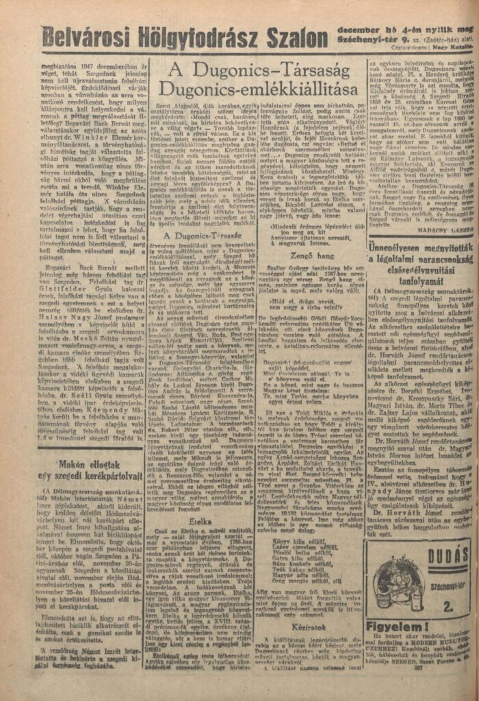 Az előző cikkben már ismertettem a Társaság háború alatti viszontagságos sorsát. Tudjuk, hogy a háború elején 1942-ben még nagyszerűen működik, mert ünnepségsorozattal és jubileumi kötettel méltatták a Dugonics Társaság 50 évét. Ekkor ünnepi rendezvény is volt: Dugonics-Emlékkiállítás a múzeum nagytermében. A korabeli Délmagyarországban Dr. Madácsy László (1907-1983) társasági tag, a kiállítás egyik rendezője, a későbbi főtitkár írt ismertetőt. Ekkori programjukban még nagy terveik voltak. De bizony ezek csak tervek maradtak, mert a Dugonics Társaság elhunyt és élő, működő íróinak munkáit felölelő 1943 március 19-i kiállítás megnyitásával és az aznapi felolvasó üléssel működését megszüntette és a német megszállás alatt már nem adott életjelt magáról. Az újjáéledés első mozzanata az volt, hogy a 20.165/1945 BM határozat végrehajtása során 1946 februárjával elrendelték a társaság átszervezését. Az egyesület önkormányzatát a tisztújító közgyűlésig felfüggesztették és ügyeinek vitelére, az átszervezés levezénylésére miniszteri biztost jelöltek ki Marót Károly egyetemi tanár személyében. Megállapította, hogy a Társaságnak vagyona nincs, irattár, jegyzőkönyvek, kiadványok alig vannak, azok a demokrácia szellemével ellenkező elveket nem tartalmaznak. Az alapszabály nem szorul lényeges javításra s a Társaság új célkitűzése: a szegedi tanyavilág kulturális emelése demokratikus szellemű.