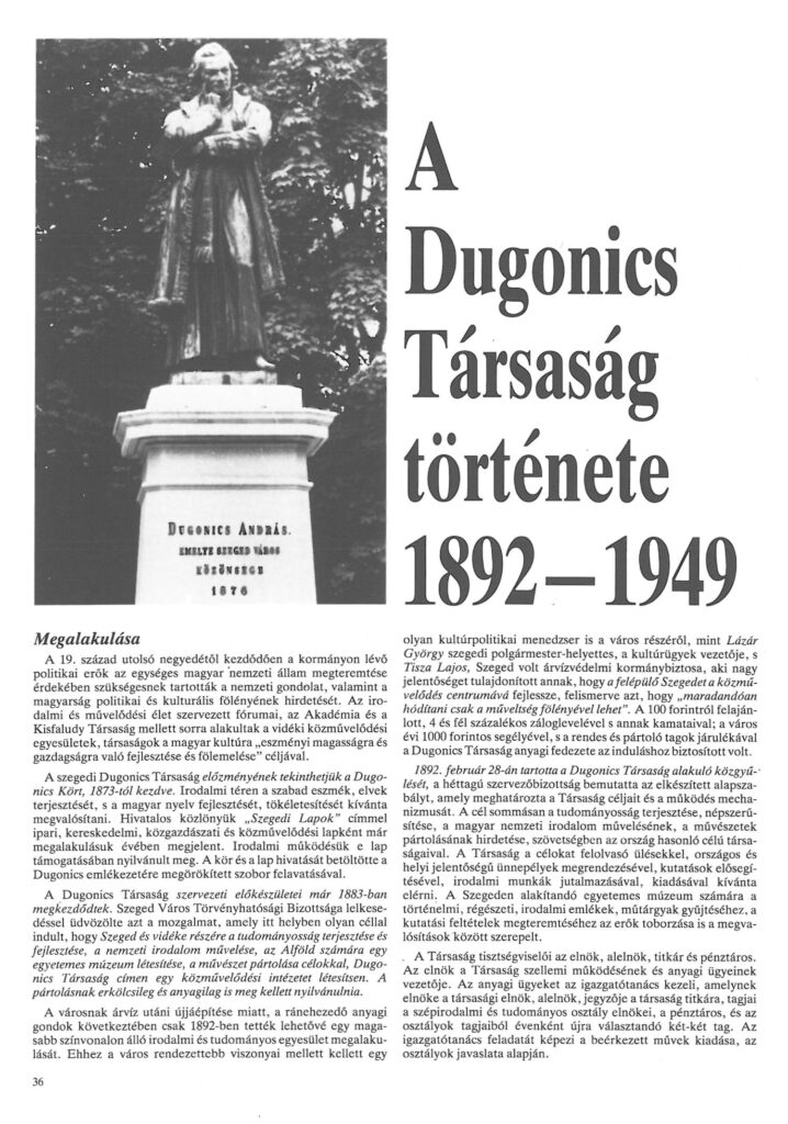 Dr. Madácsy Piroska 1986-os Délmagyarországban megjelent írását és Dunainé Bognár Júlia 1990-91-es, a Dugonics Társaság történetét ismertető cikkét az előző oldalakon méltattam. A Társaság 112 főt számláló nagyszerű, 1993-94-es névsorát az előző számunkban olvashattuk.