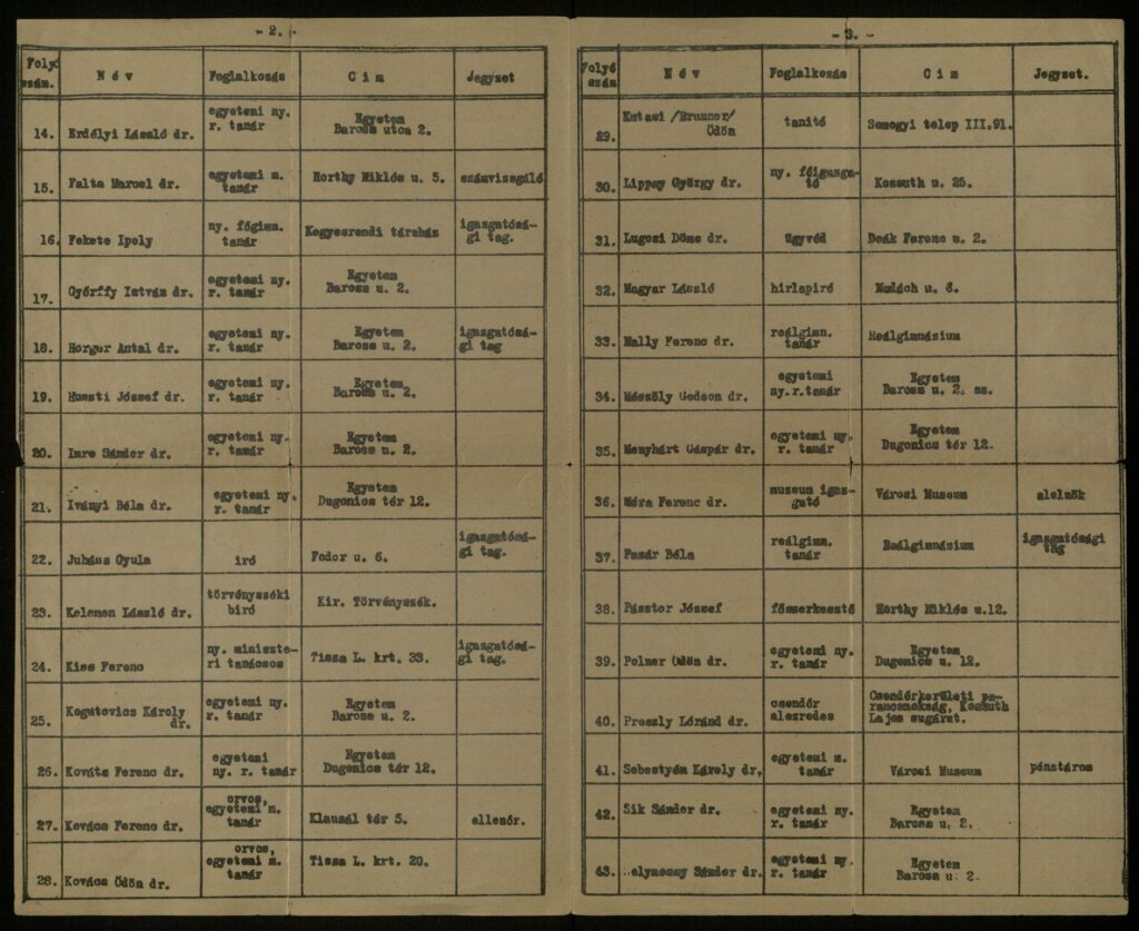 - Nyilvánvalóan Nagyapám ekkor kapta meg a vezetőségtől „a Dugonics Társaság rendes és helybeli tiszteleti tagjai 1933.” feliratú korabeli sokszorosítással készült, tételesen keretbe foglalt névsorát, melynek a fejléce az alábbi kategóriákat adta meg a tagok neve mellé: Folyószám, Név, Foglalkozás, Cím és Jegyzet. A névsor 50 rendes tagon kívül 5 helybeli tiszteleti tagot sorol fel. A listán Nagyapám már számvizsgálóként szerepel. A névsort a lakcím felsorolása nélkül közlöm, mert a lista önmagáért beszél, a mai olvasó számára döbbenetes hatású szellemi erőt sugároz. A nevek a következők: Balla Jenő szerkesztő, Banner János dr. egyetemi c. ny.rk. tanár, adjunktus, titkár, Bartók György dr. egyetemi ny. r. tanár, Berczeli Anzeln Károly dr. író, Bibó István dr. miniszteri tanácsos egyetemi könyvtár igazgató,Bucsy István reálgim. tanár, számvizsgáló, Buday Árpád dr. egyetemi ny. r. tanár, igazgatósági póttag, Czógler Kálmán reáliskolai tanár, számvizsgáló, Czeizel János középiskolai igazgató, igazgatósági tag, Csefkó Gyula dr. egyetemi m tanár, polg. isk.r. tanár, igazgatósági tag, Csengery János dr. nyug. egyet. ny. r. tanár, igazgatósági tag, Dobay Gyula dr. ügyvéd volt főispán kormánybiztos, Eckerdt Elek keresk. isk.tanár, Erdélyi László dr. egyetemi ny. r. tanár, Falta Marcel dr. egyetemi m. tanár, számvizsgáló, Fekete Ipoly ny. főgimn. tanár, igazgatósági tag, Györffy István dr. egyetemi ny. r. tanár, Horger Antal dr. egyetemi ny. r. tanár, igazgatósági tag, Huszti József dr. egyetemi ny. r. tanár, Imre Sándor dr. egyetemi ny. r. tanár, Iványi Béla dr. egyetemi ny. r. tanár, Juhász Gyula író, igazgatósági tag, Kelemen László dr. törvényszéki bíró, Kiss Ferenc ny. miniszteri tanácsos, igazgatósági tag, Kogutovicz Károly dr. egyetemi ny. r. tanár, Kováts Ferenc dr. orvos egyetemi m. tanár, ellenőr, Kovács Ödön dr. orvos egyetemi m. tanár, Kutasi (Brunner) Ödön tanító, Lippay György dr. ny. főigazgató, Lugosi Döme dr. ügyvéd, Magyar László hírlapíró, Mally Ferenc dr. reálgimn. tanár, Mészöly Gedeon dr. egyetemi ny. r. tanár, Menyhárt Gáspár dr. egyetemi ny. r. tanár, Móra Ferenc dr. múzeumigazgató, alelnök, Pazár Béla reálgimn. tanár, igazgatósági tag, Pásztor József főszerkesztő, Polner Ödön dr. egyetemi ny. r. tanár, Preszly Lóránd dr. csendőr alezredes, Sebestyén Károly dr. egyetemi m. tanár pénztáros, Sík Sándor dr. egyetemi ny. r. tanár, Solymossy Sándor dr. egyetemi ny. r. tanár, Szalay József dr. ny. m. kir. rendőrkerületi főkapitány elnök, Sz. Szigethy Vilmos városi főlevéltáros, igazgatósági tag, Tihanyi Béla dr. gimnáziumi igazgató, igazgatósági póttag, Tonelli Sándot dr. kamarai főtitkár, alelnök, Turcsányi Imre dr. főorvos, Vidákovich Kamilló dr. egyetemi ny. r. tanát, Zolnai Béla dr. egyetemi ny. r. tanár, igazgatósági tag. Ekkor még a Dugonics Társaságnak egyetlen nő tagja sem volt.[4]