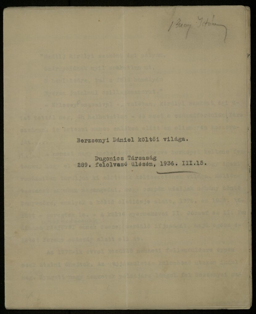 - Értékes és élvezetes olvasmány Nagyapám egyik fennmaradt 16 gépírású oldalból álló előadása Berzsenyi Dániel költői világa címmel. Elhangzott a Dugonics Társaság 289. felolvasó ülésén 1936. III. 15-én.