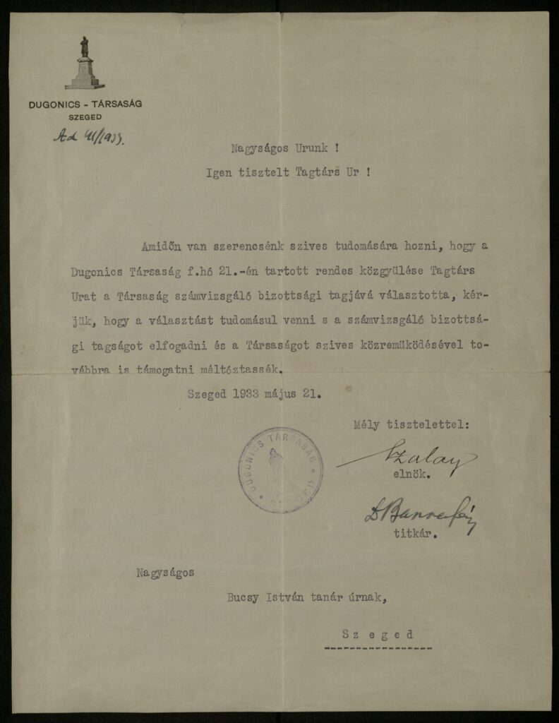 - A Társaság Dugonics szobros emblémájú 1933 május 21-én iktatott gépírású levelében Banner János titkár és Szalay József elnök így ír Nagyapámnak: „Amidőn van szerencsénk szíves tudomására hozni, hogy a Dugonics Társaság f. hó 21-én tartott rendes közgyűlése Tagtárs Urat a Társaság számvizsgáló Bizottsági tagjává választotta.” A Nagyságos Bucsy István tanár úr megszólítással a korabeli elnevezéssel igazgatósági tag, vagyis a mai értelemben vezetőségi tag lett, ami bizony igen megtisztelő dolog volt abban az időben. A levél külleme esztétikai szempontból is szép.
